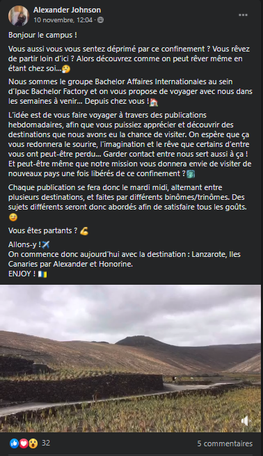 L’objectif est de mettre en avant les voyages réalisés par des camarades / des formateurs et de mettre en avant des activités insolites et particulières. Les étudiants Ipac Bachelor Factory ont eu pour mission de développer leur créativité pour tout simplement… nous faire rêver de chez nous à l’aide de quizz, de vidéo, d’expériences vécues… !